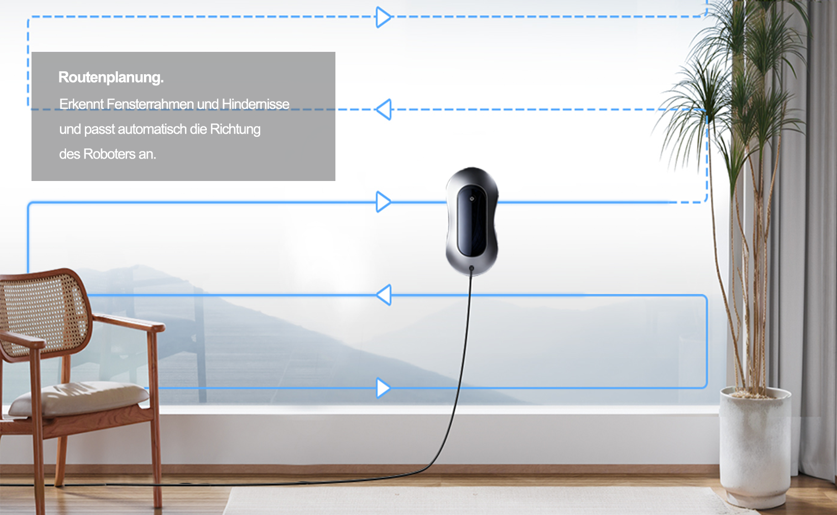 Es verfügt über intelligente Algorithmen, die automatisch Reinigungsrouten planen, um sicherzustellen, dass jeder Teil des Fensters sauber ist.